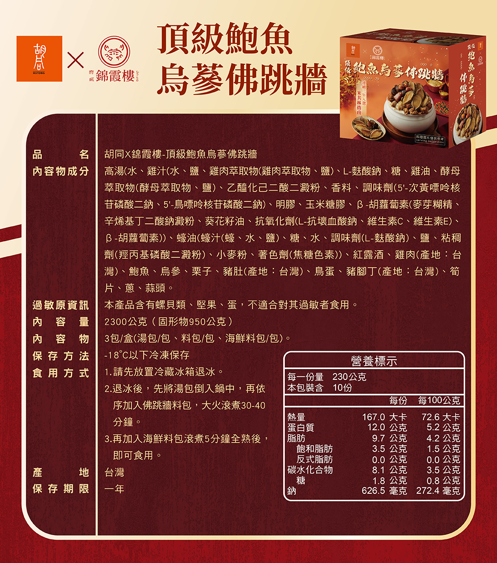 成分:高湯(水、雞汁(水、鹽、雞肉萃取物 (雞肉萃取物、鹽) 、L-麩酸鈉、糖、雞油、酵母萃取物(酵母萃取物、鹽)、乙醯化己二酸二澱粉、香料、調味劑(5'-次黃嘌呤核苷磷酸二鈉、5'-鳥嘌呤核苷磷酸二鈉)、明膠、玉米糖膠、β-胡蘿蔔素(麥芽糊精、辛烯基丁二酸鈉澱粉、葵花籽油、抗氧化劑(L-抗壞血酸鈉、維生素C、維生素E)、β-胡蘿蔔素))、蠔油(蠔汁(蠔、水、鹽)、糖、水、調味劑(L-麩酸鈉)、鹽、粘稠劑(羥丙基磷酸二澱粉)、小麥粉、著色劑(焦糖色素))、紅露酒(米、紅麴、精製食用酒精)、雞肉(產地:台灣)、鮑魚、烏參、栗子、豬肚(產地:台灣)、鳥蛋、豬腳丁(產地:台灣)、筍片、蔥、蒜頭