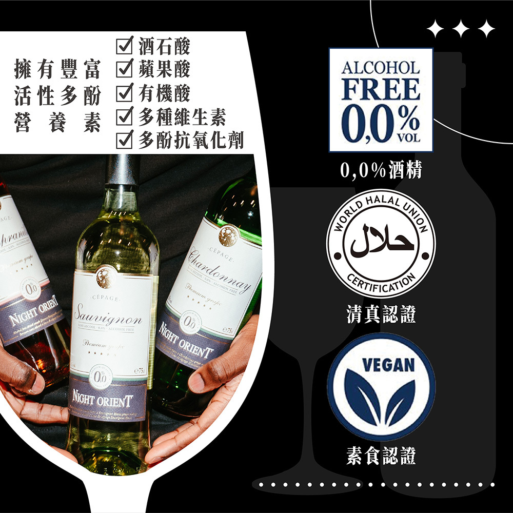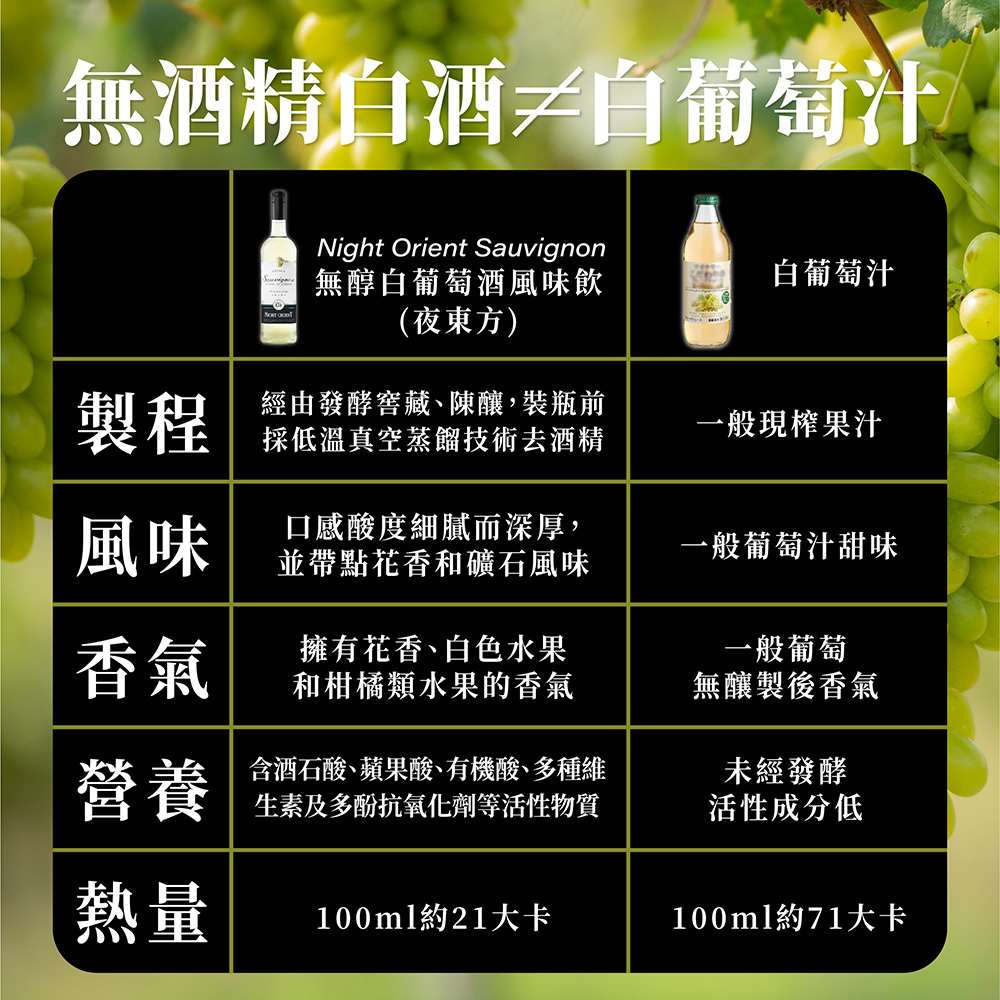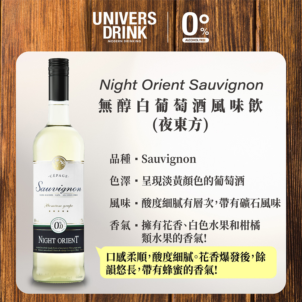 Night Orient Sauvignon無酒精白酒採用的Sauvignon白葡萄,經過發酵、窖藏、陳釀,而在裝瓶之前,多了經過特殊工藝脫醇過濾去掉酒精的步驟。