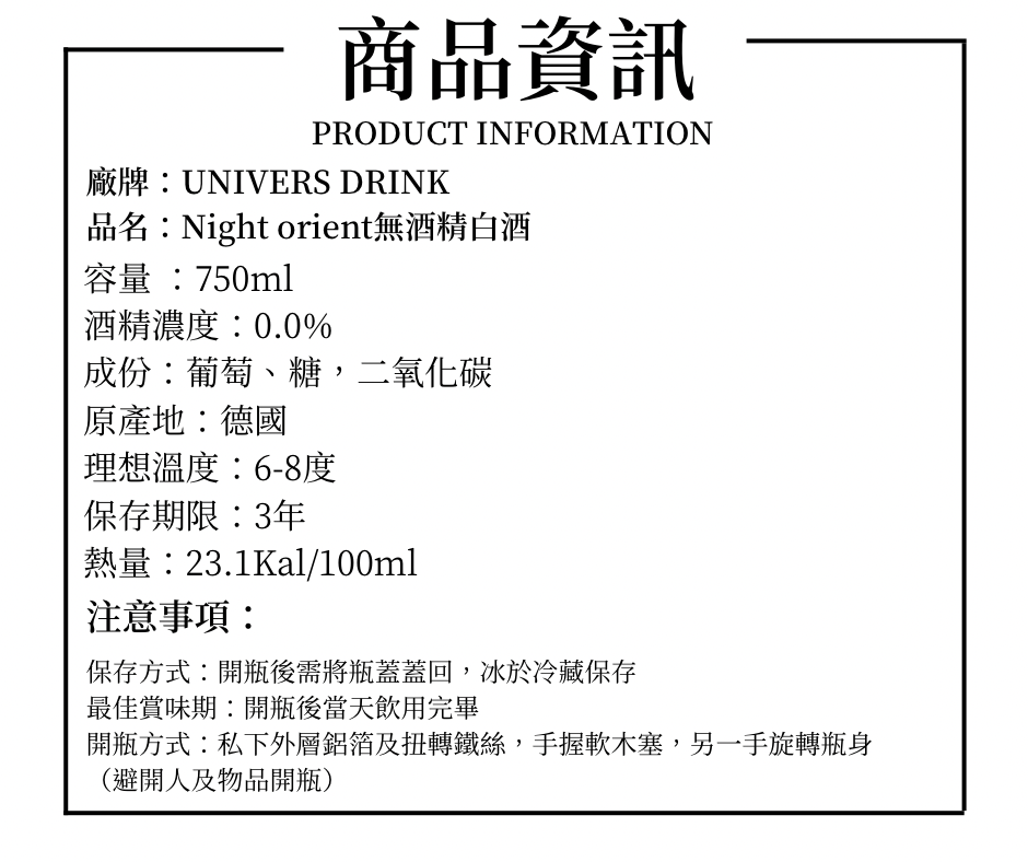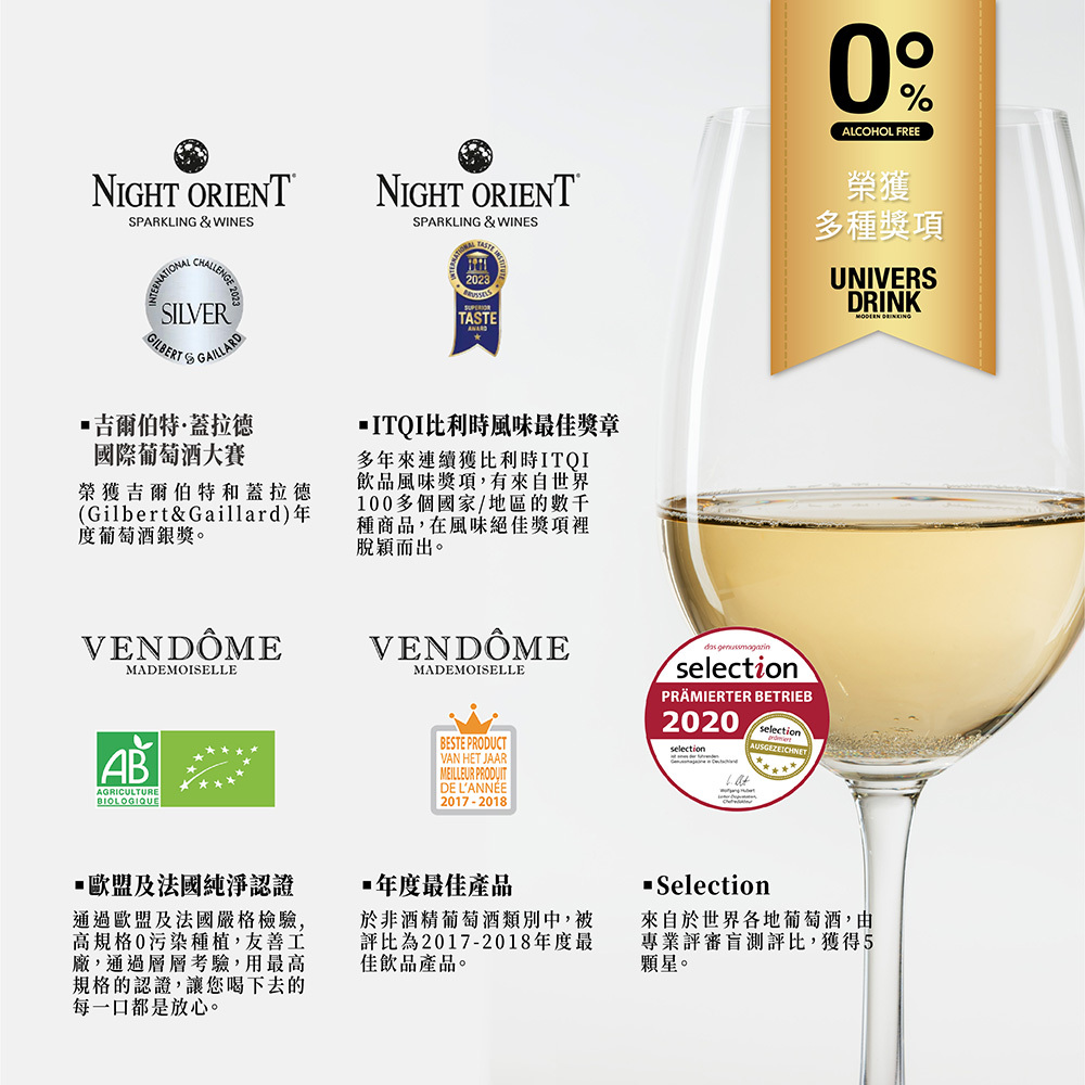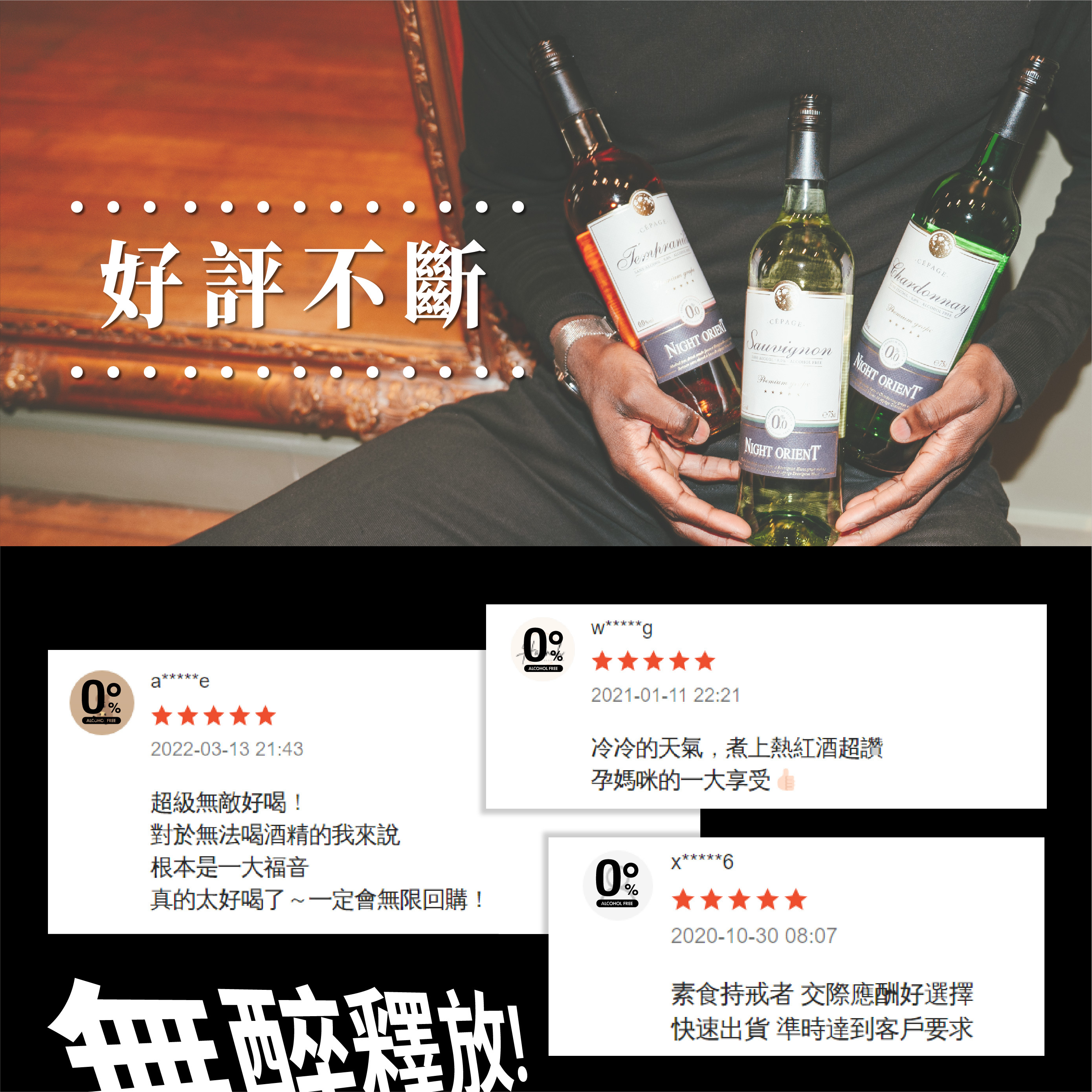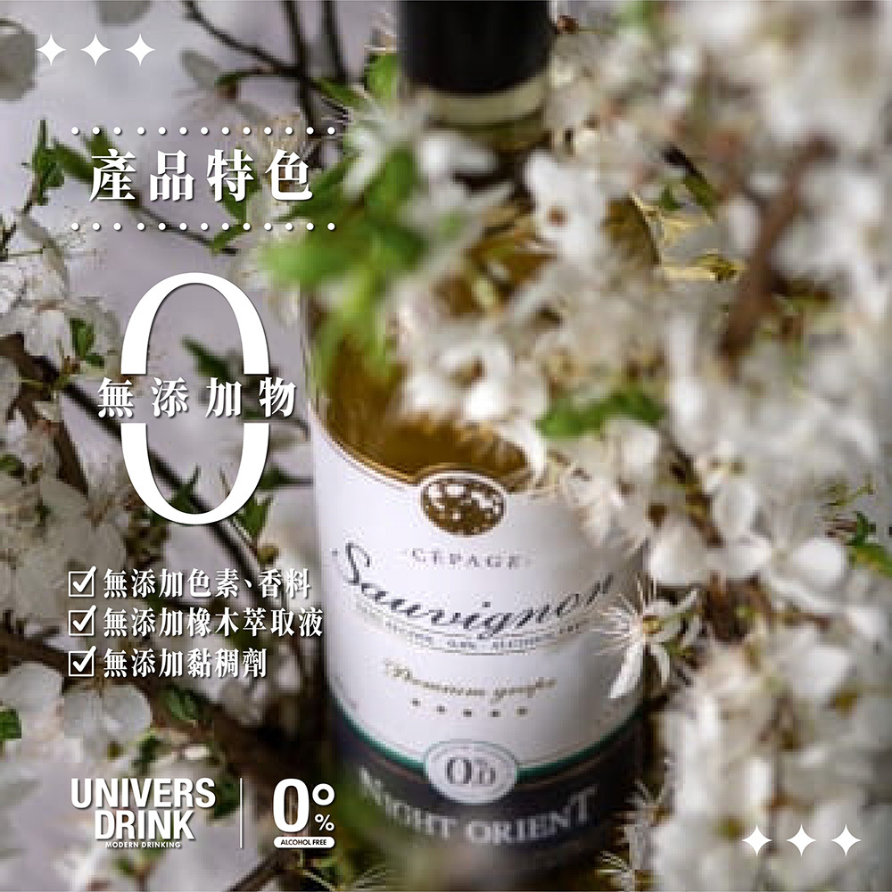 Night Orient Sauvignon無酒精白酒採用的Sauvignon白葡萄,經過發酵、窖藏、陳釀,而在裝瓶之前,多了經過特殊工藝脫醇過濾去掉酒精的步驟。