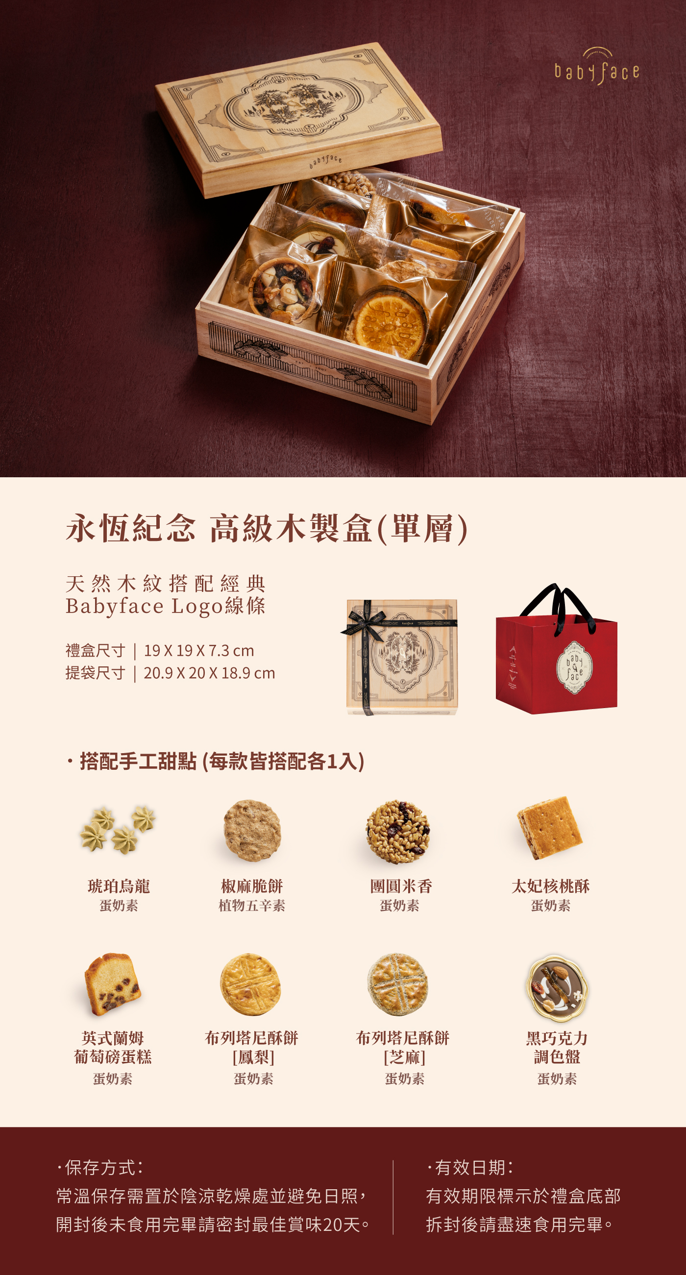 太妃核桃酥、琥珀烏龍、芝麻布列塔尼酥餅、鳳梨布列塔尼酥餅、黑巧克力調色盤、團圓米香、椒麻脆餅、英式蘭姆葡萄磅蛋糕