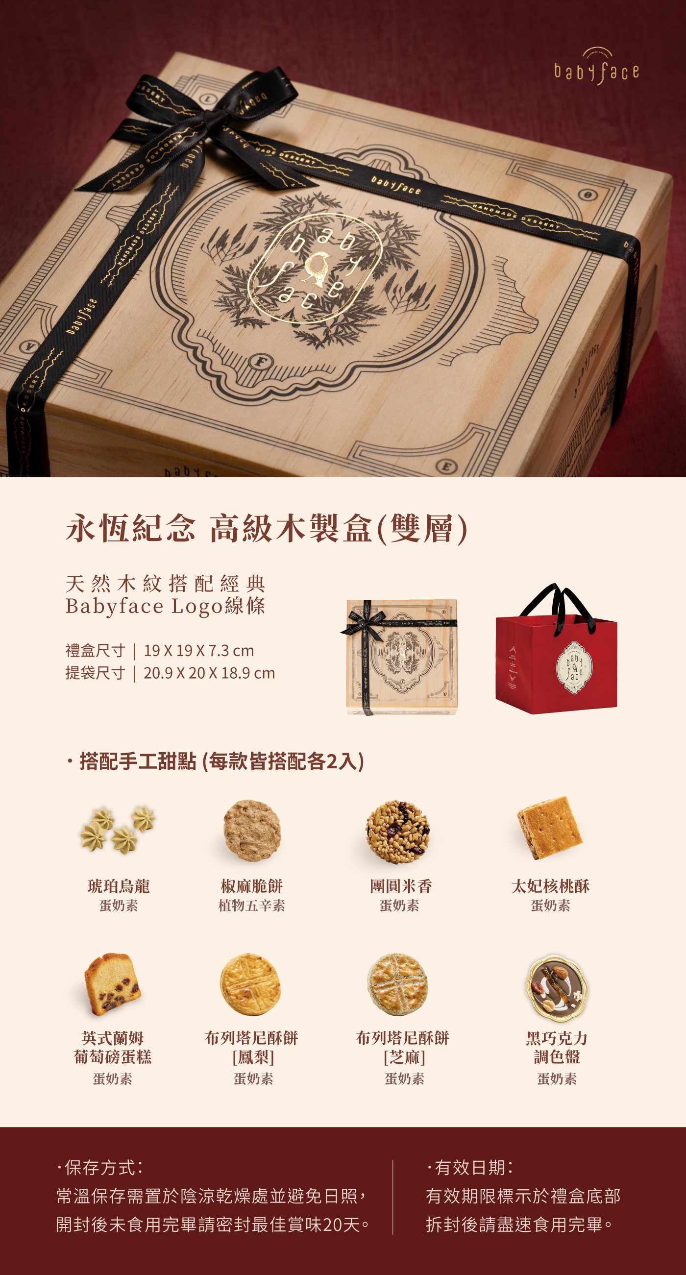太妃核桃酥、琥珀烏龍、芝麻布列塔尼酥餅、鳳梨布列塔尼酥餅、黑巧克力調色盤、團圓米香、椒麻脆餅、英式蘭姆葡萄磅蛋糕