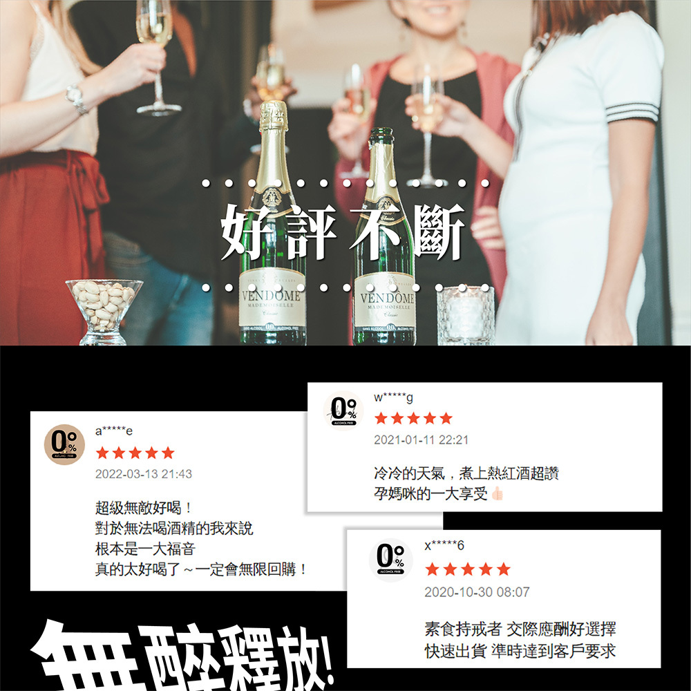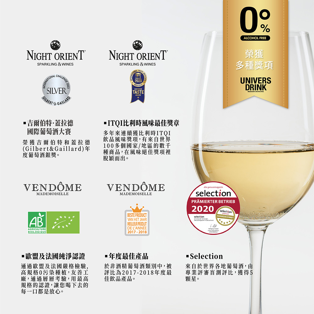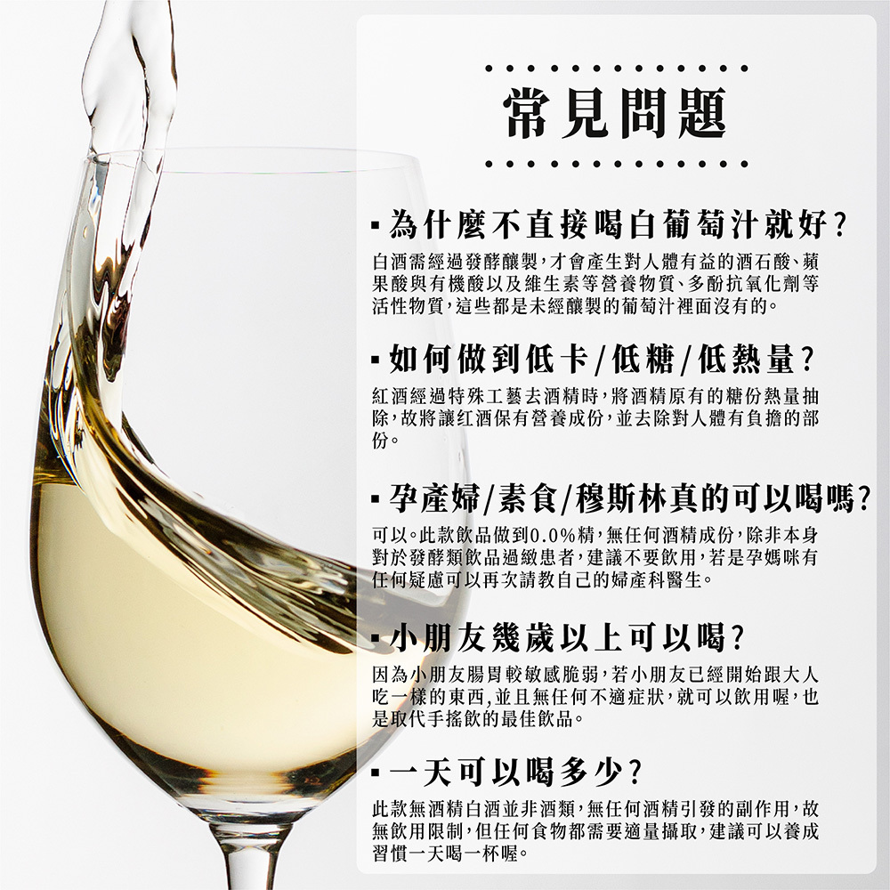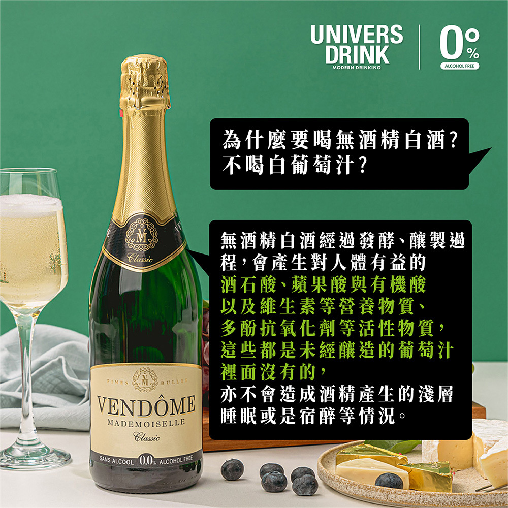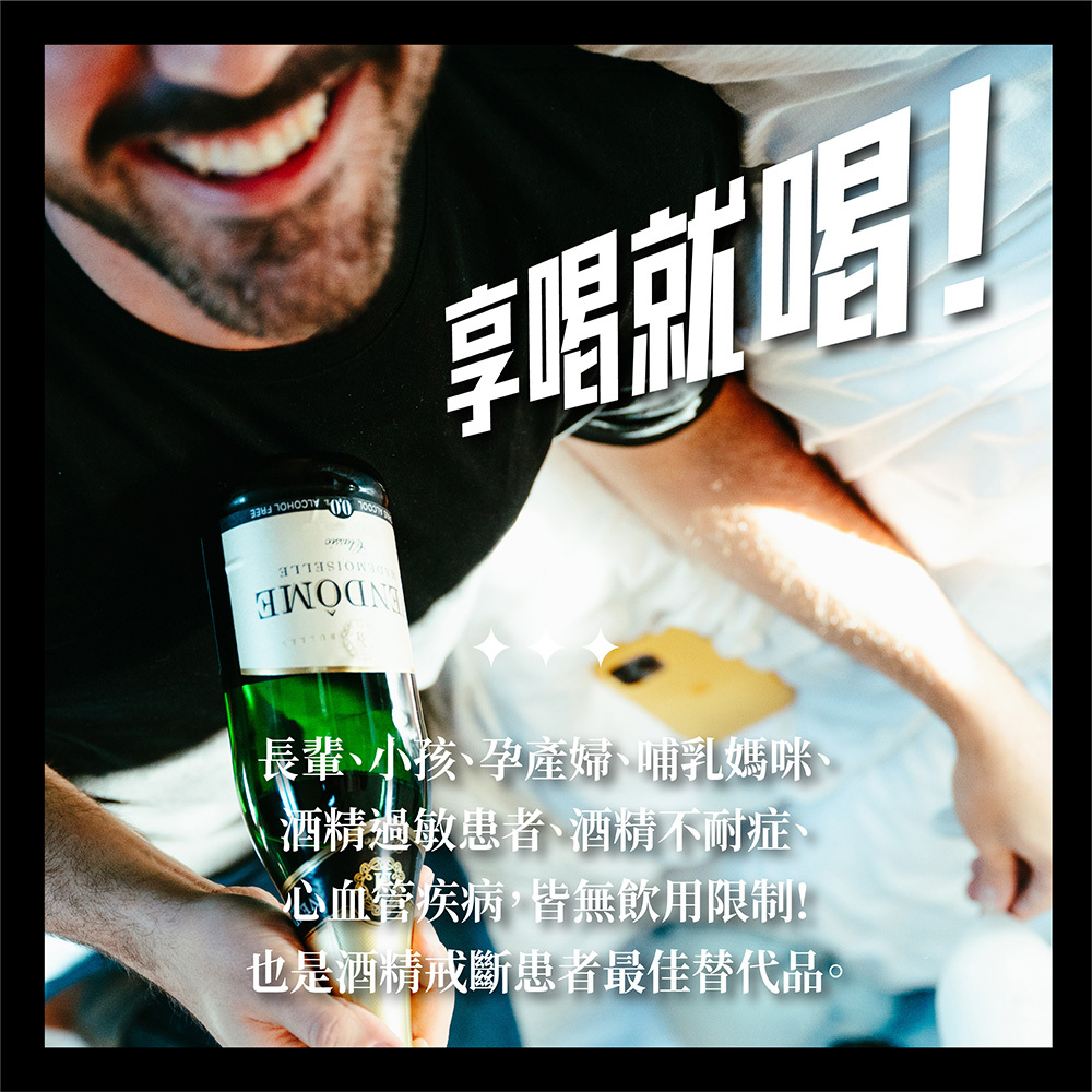 孕產婦/小朋友/酒精過敏患者/酒精不耐症等,皆無飲用限制,更適合任何歡慶時刻、餐前酒、海鮮及搭配甜點。