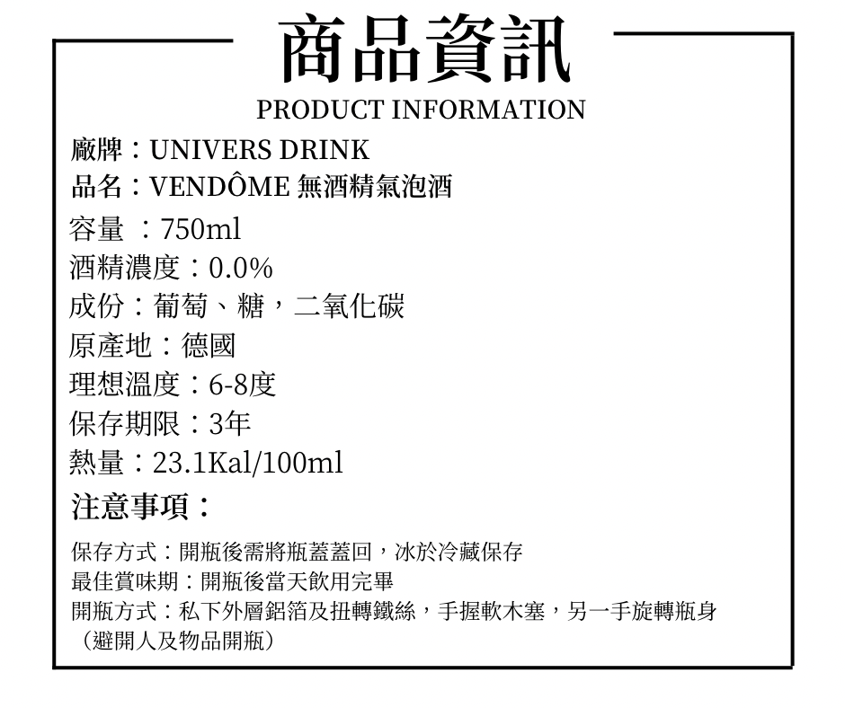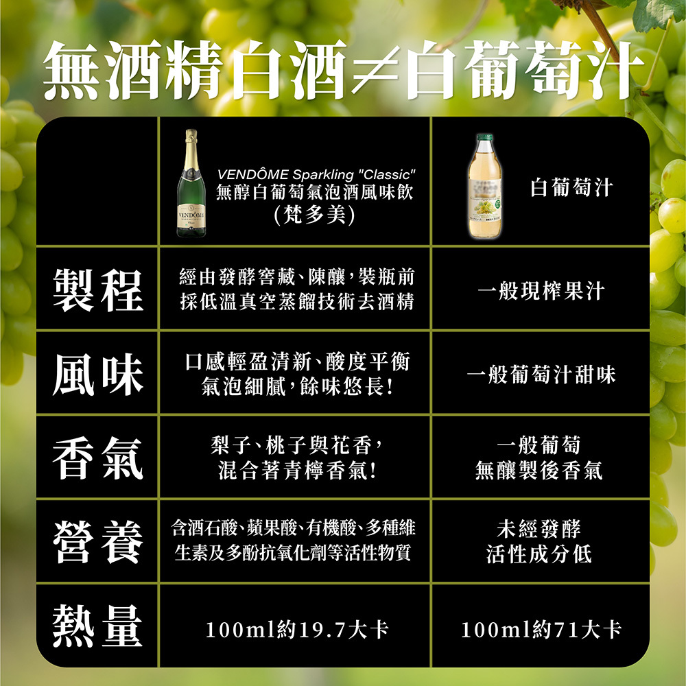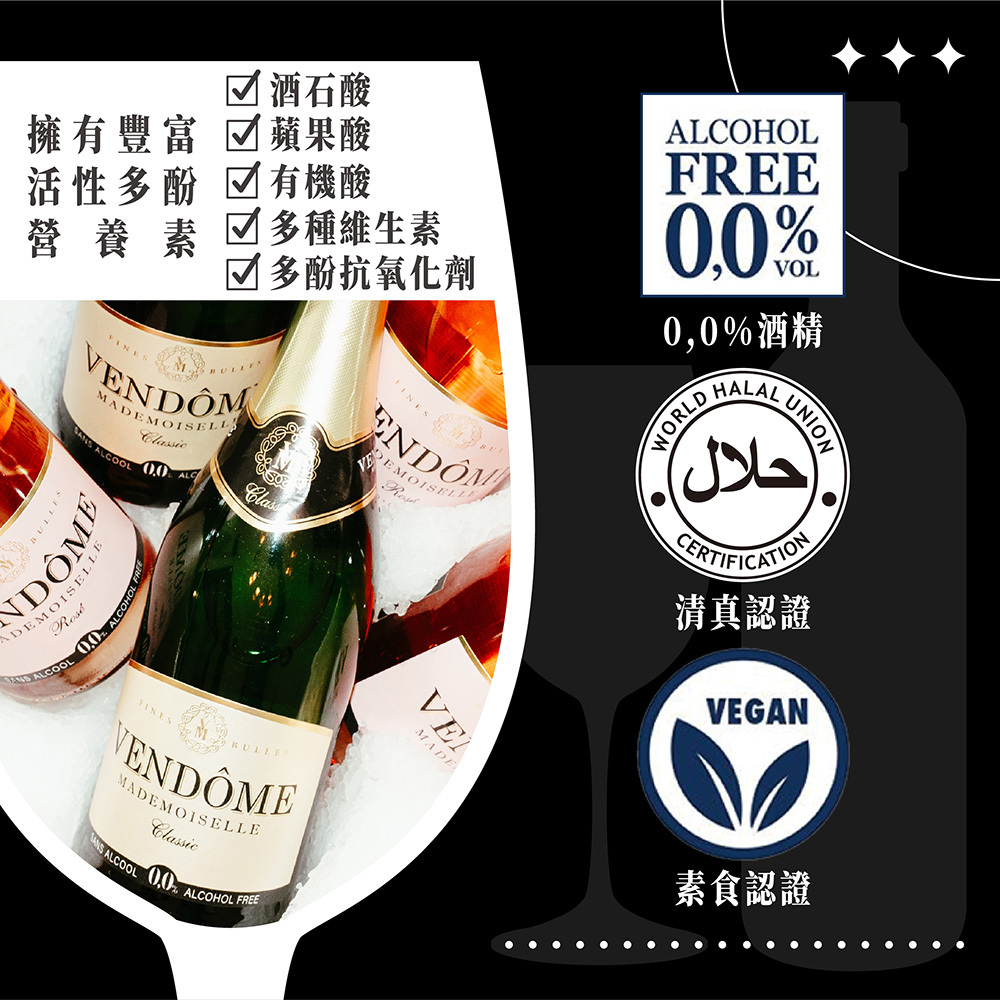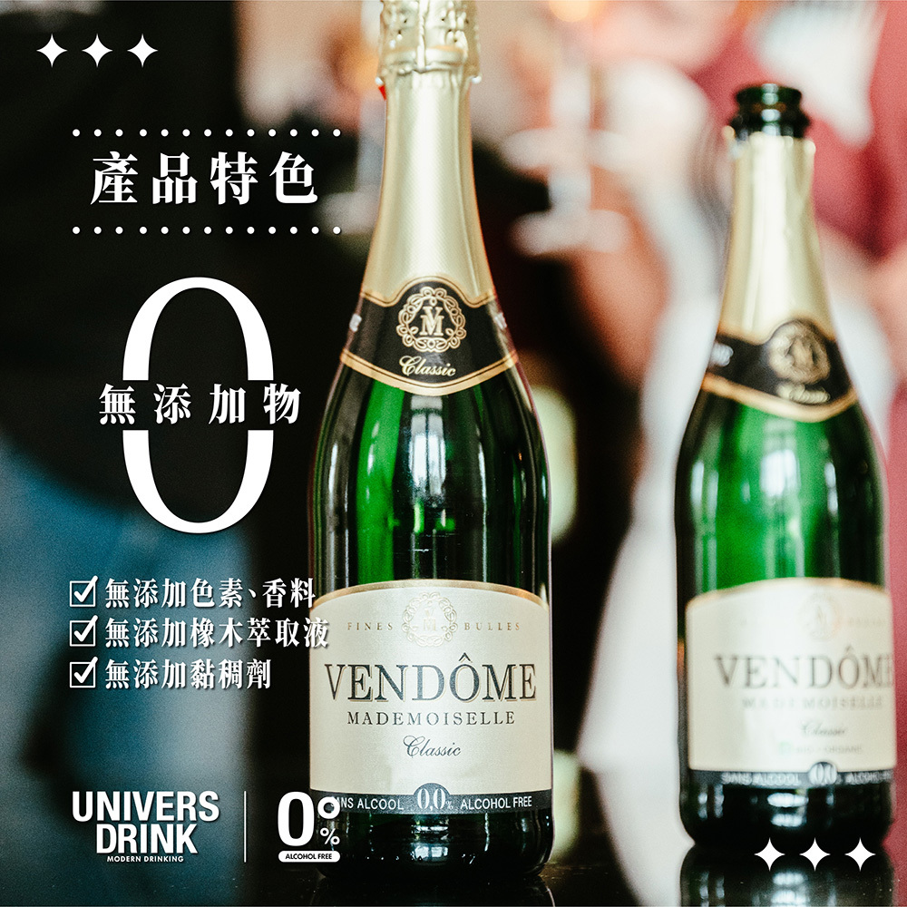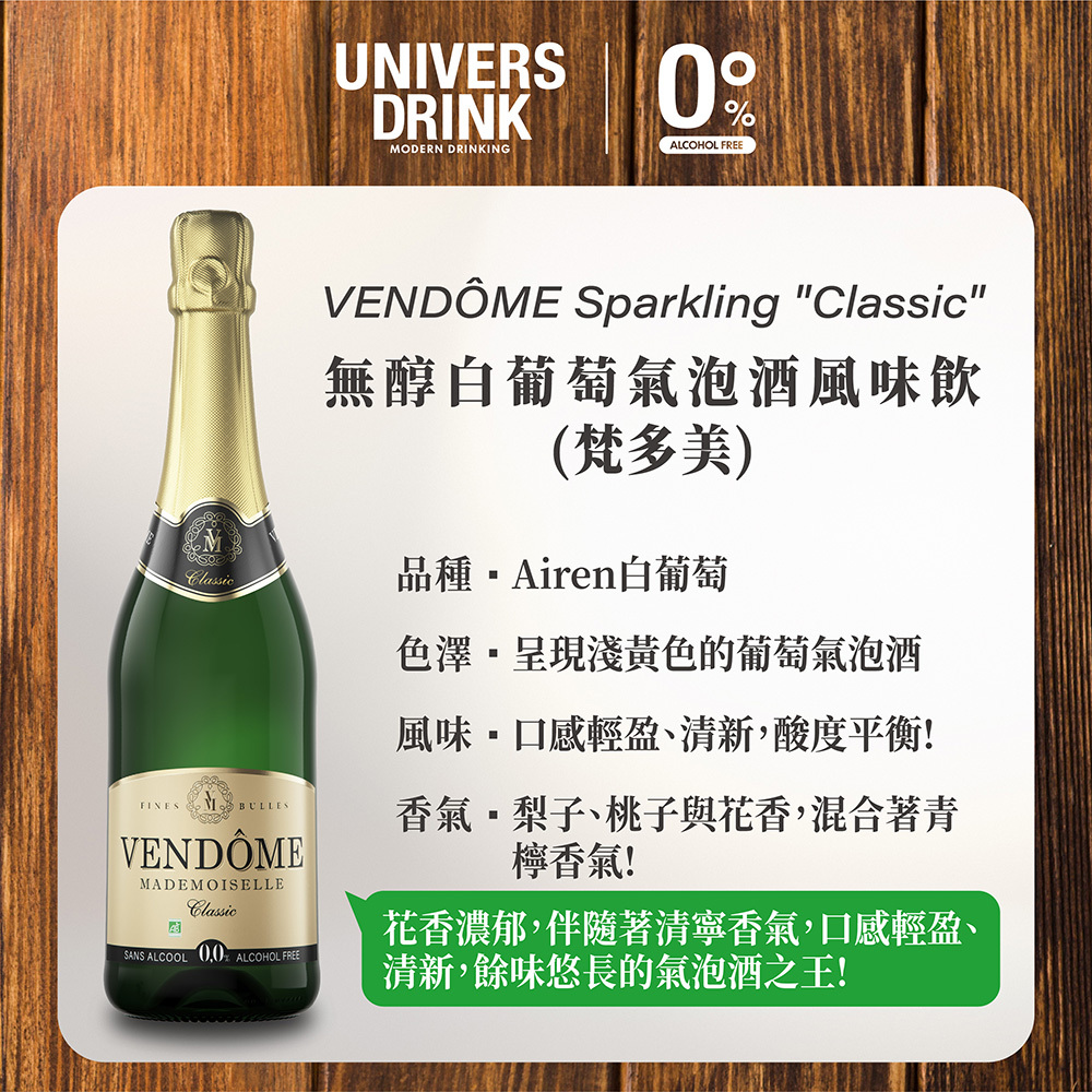VENDÔME Sparkling "Classic" 無酒精白葡萄氣泡酒,採用的阿依蓮白葡萄,種植地為西班牙La Mancha地區,經過發酵、窖藏、陳釀,而在裝瓶之前,多了經過特殊工藝脫醇過濾去掉酒精的步驟。